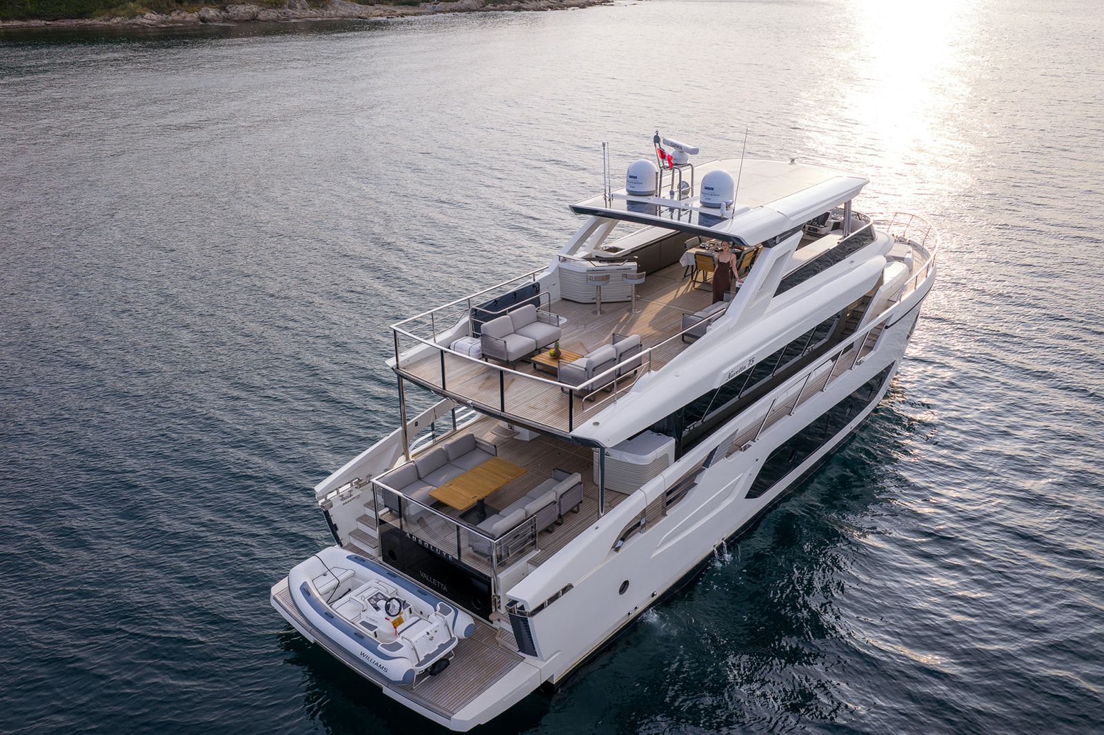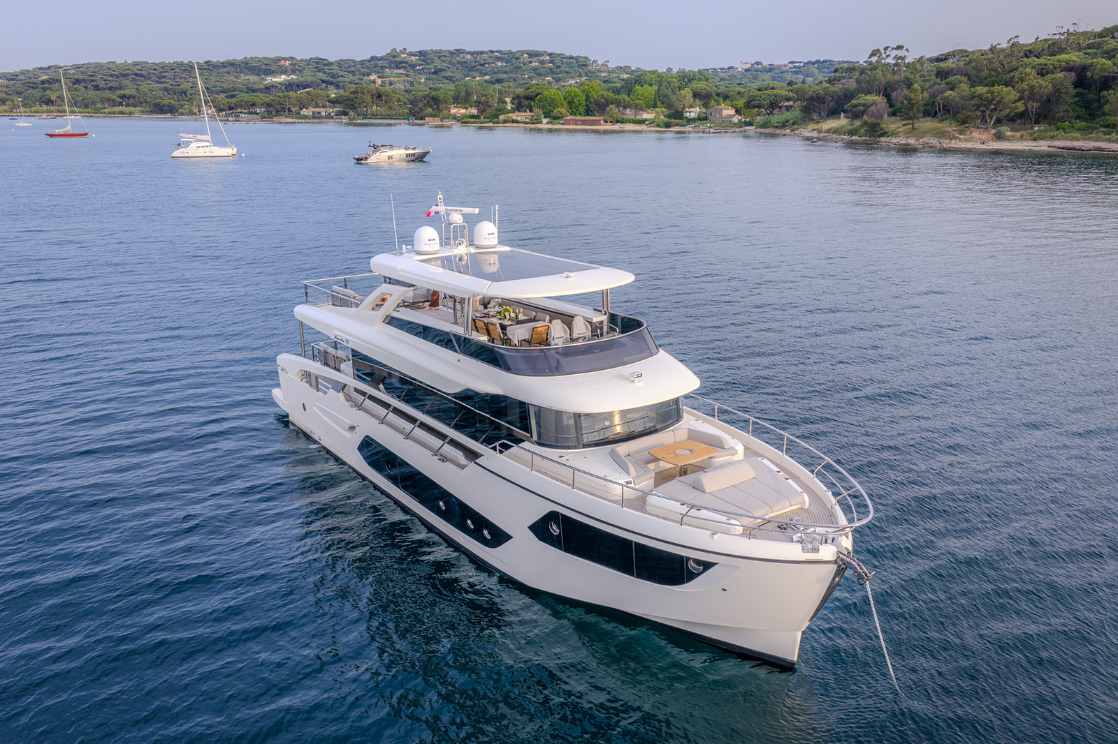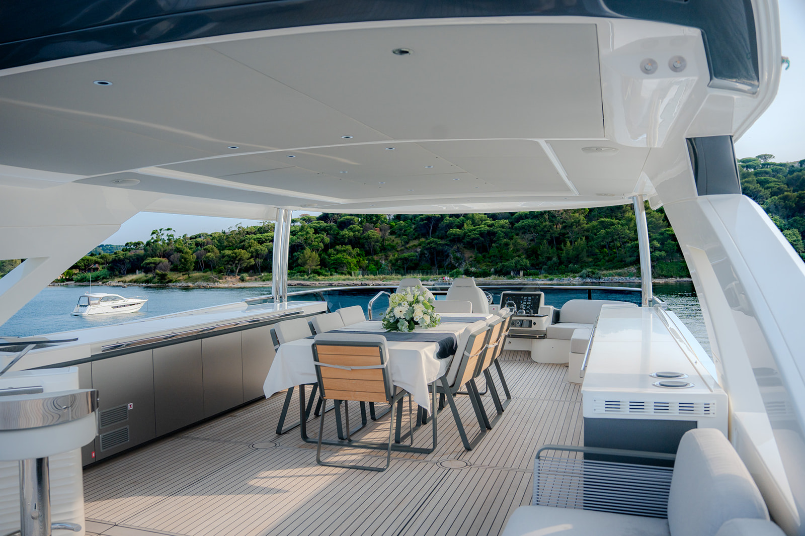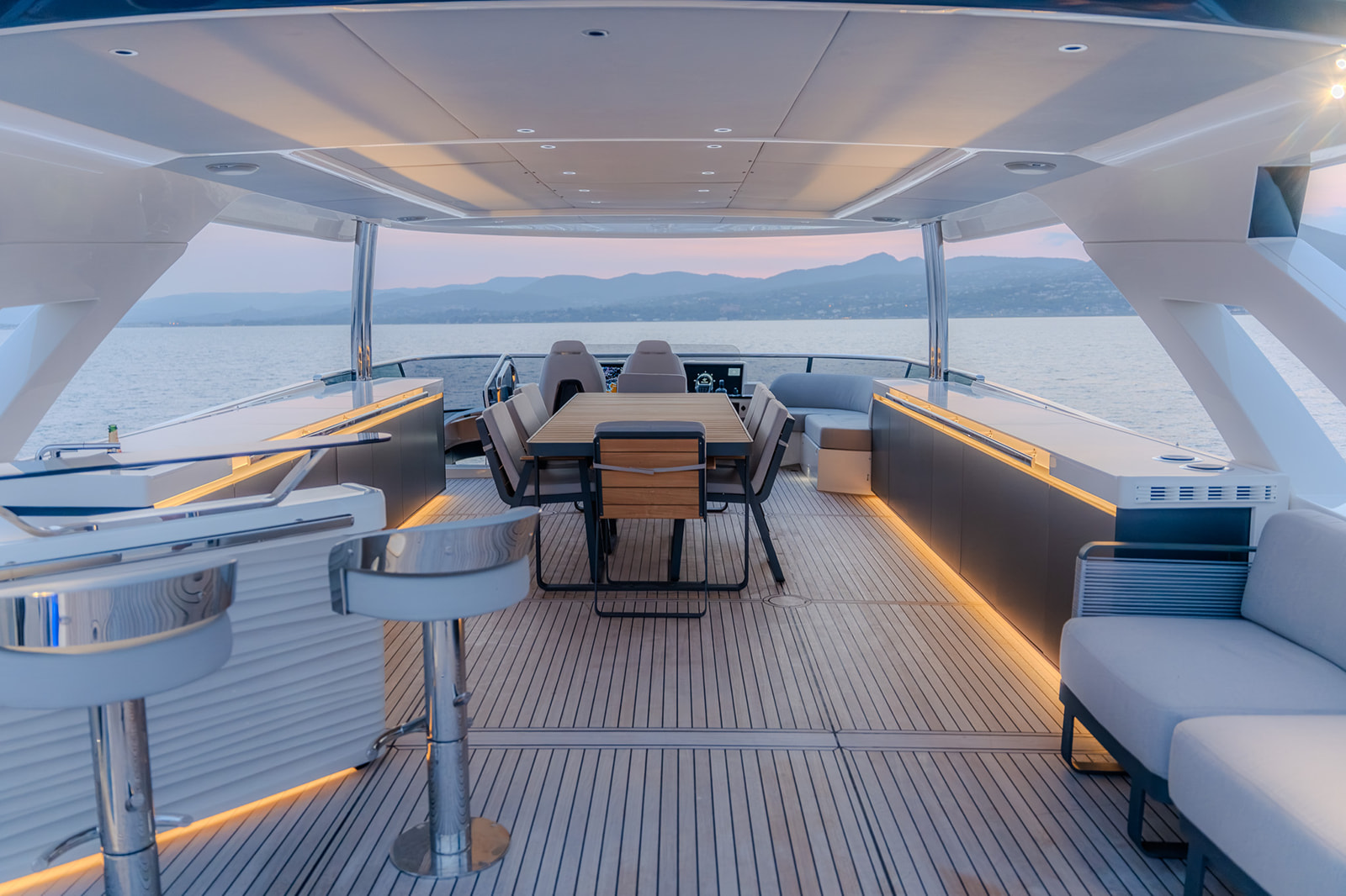Imaginez-vous glisser le long de la côte à une vitesse de croisière de 12 nœuds, bercé par la brise marine et profitant d'une vue imprenable grâce aux larges baies vitrées du yacht. De généreux espaces extérieurs offrent un cadre idéal pour les belles journées en mer, avec notamment un flybridge équipé d'un bar et d'un espace repas en plein air pouvant accueillir jusqu'à huit convives, ainsi qu'un aménagement avant modulable qui se transforme en bain de soleil ou en salon. Que ce soit pour se prélasser au soleil ou partager un verre entre amis, SEMELA offre le cadre parfait pour se détendre et savourer chaque instant en mer.
