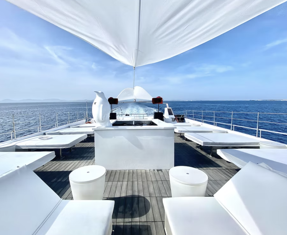 This flagship floating beach club transforms the concept of yacht charter into something far more powerful: a fully immersive event venue surrounded by the Mediterranean. With vast open deck space, multiple lounge zones, and a high-energy dance floor, it creates the perfect setting for large groups to connect, celebrate and experience Ibiza from a completely different perspective.