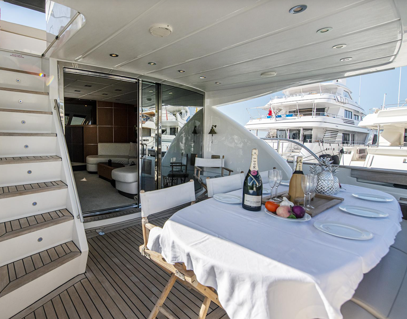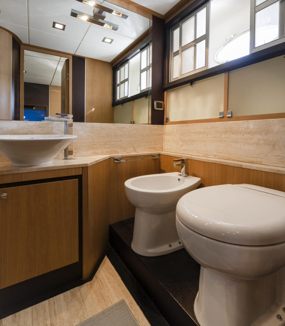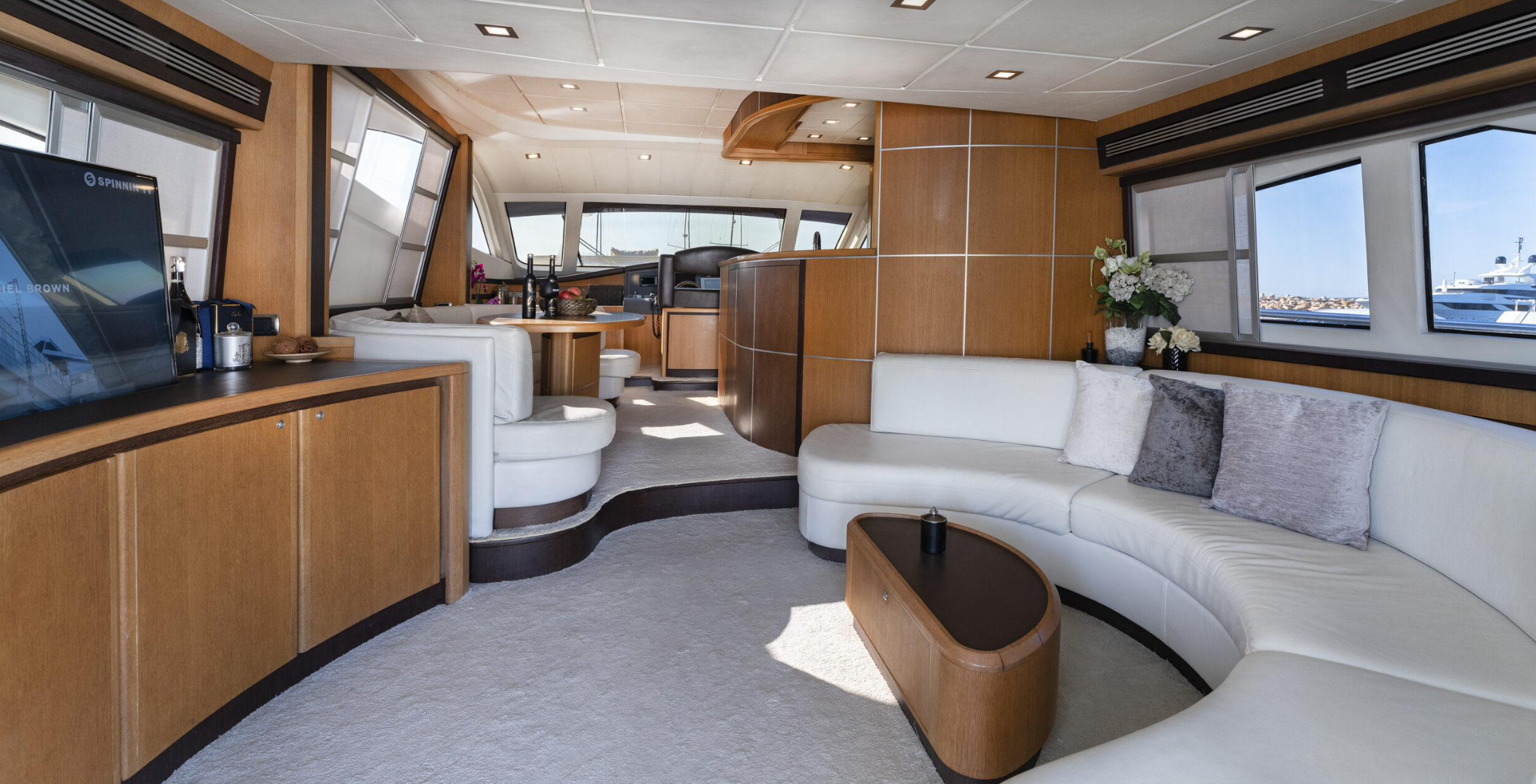 Designed for up to 10 guests during day charters, the Abacus 70 offers expansive sunbathing areas, inviting outdoor lounges, and a panoramic flybridge ideal for soaking up Mediterranean views. Inside, the split-level saloon features plush sofas, dining areas, Smart TV, Bluetooth sound system, and internet connectivity, creating a sophisticated yet relaxed atmosphere throughout.