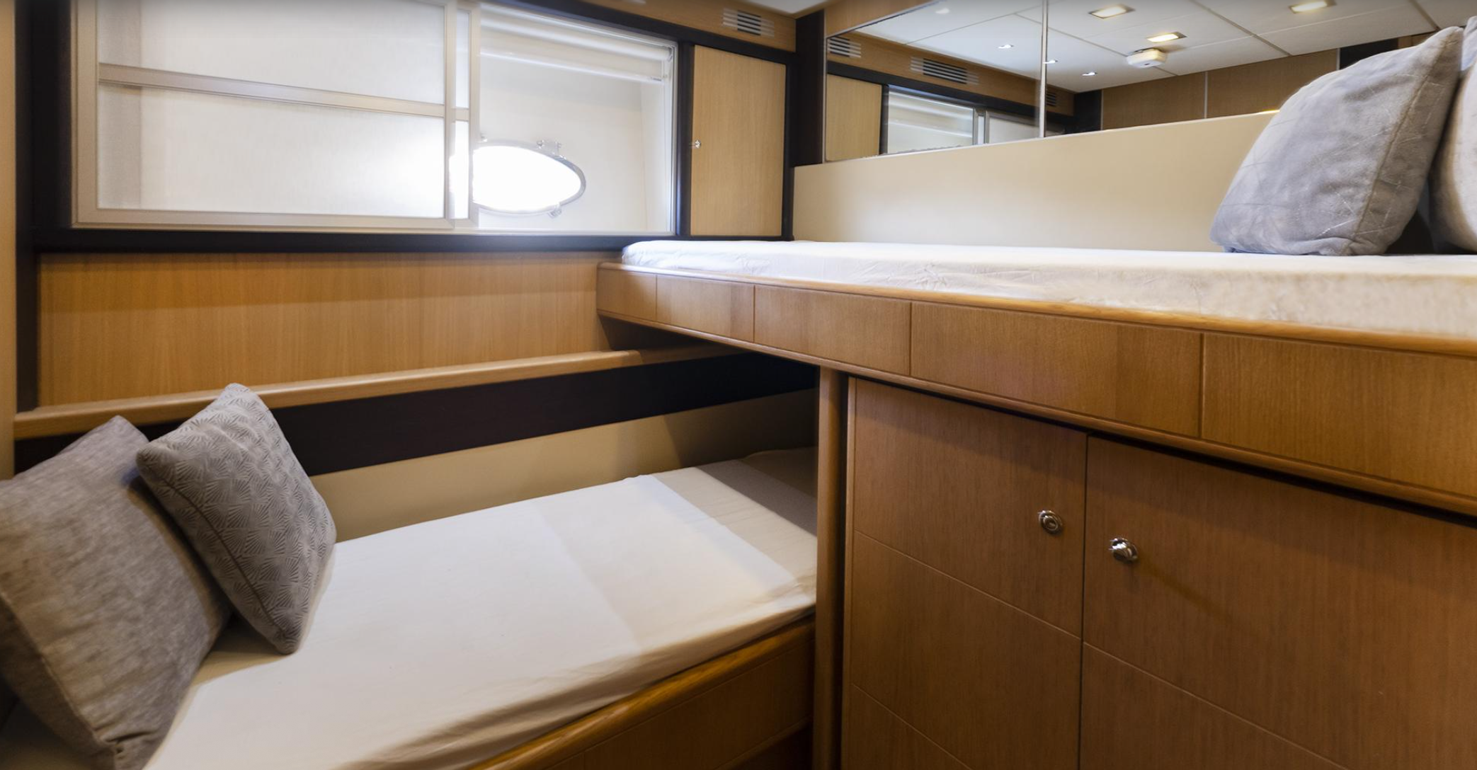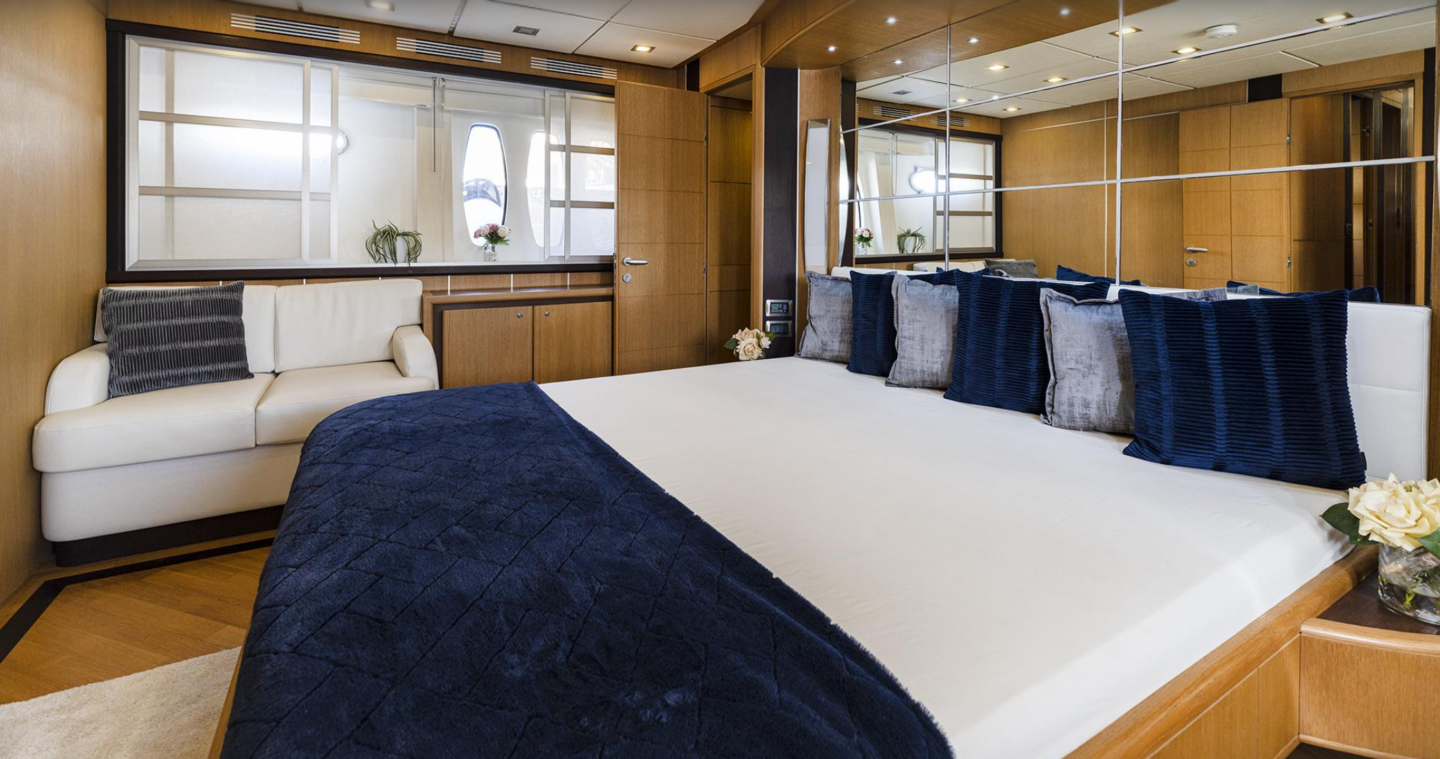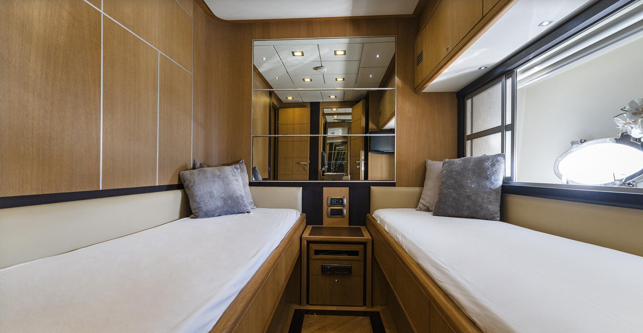 For extended stays, she comfortably accommodates 8 adults across four beautifully appointed cabins — two doubles and two twins — each with its own en-suite bathroom. A fully equipped galley with fridge, freezer, oven, hob, microwave, grill, and washing machine ensures every comfort of home while at sea.